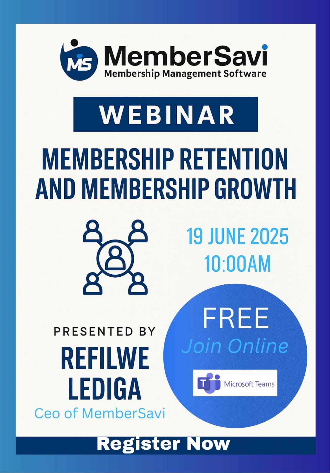 Virtual WebinarJoin MembersSavi for an exclusive online webinar on "Member Retention & Growth" hosted by CEO Refilwe Lediga. Discover actionable strategies to keep your members engaged and grow your community.